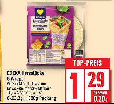 Sehen Sie sich das Edeka Herzstücke 6 Wraps Angebot bei Edeka an! Dieses fantastische Angebot ist jetzt im neuesten Edeka Prospekt verfügbar. Nutzen Sie diese Chance und sparen Sie viel bei Ihrem Einkauf.