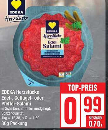 Sehen Sie sich das Edeka Herzstücke Edel- Salami Angebot bei Edeka an! Dieses fantastische Angebot ist jetzt im neuesten Edeka Prospekt verfügbar. Nutzen Sie diese Chance und sparen Sie viel bei Ihrem Einkauf.