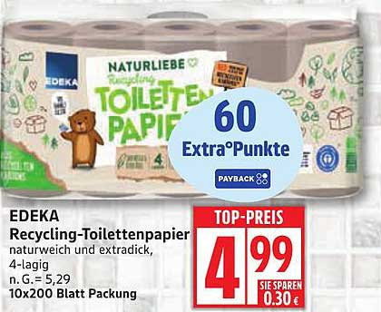 Sehen Sie sich jetzt das EDEKA Recycling-Toilettenpapier - natürlich weich und extradick, 4-lagig Angebot im Edeka Prospekt an. Dieses Angebot ist gültig von 22.09.2025 bis 27.09.2025.