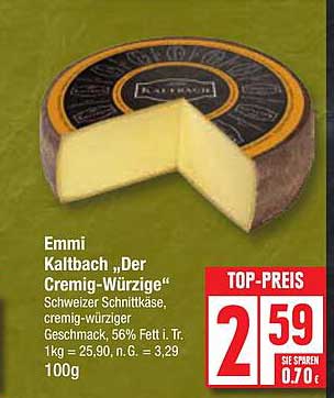 Sehen Sie sich das Emmi Kaltbach „Der Cremig-Würzige“ Angebot bei Edeka an! Dieses fantastische Angebot ist jetzt im neuesten Edeka Prospekt verfügbar. Nutzen Sie diese Chance und sparen Sie viel bei Ihrem Einkauf.