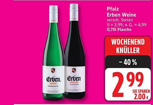 Sehen Sie sich jetzt das Erben Weine von Pfalz – Verschiedene Sorten zum Spitzenpreis! Angebot im Edeka Prospekt an. Dieses Angebot ist gültig von 14.07.2025 bis 19.07.2025.
