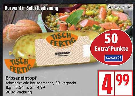 Sehen Sie sich jetzt das Erbseneintopf 900g für nur 4,99 € Angebot im Edeka Prospekt an. Dieses Angebot ist gültig von 22.09.2025 bis 27.09.2025.