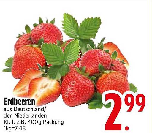 Sehen Sie sich jetzt das Erdbeeren aus Deutschland/den Niederlanden, KL. I, z.B. 400g Packung Angebot im Edeka Prospekt an. Dieses Angebot ist gültig von 28.04.2025 bis 03.05.2025.