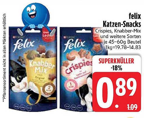Sehen Sie sich jetzt das felix Katzen-Snacks - Crispies und Knabber-Mix Angebot im Edeka Prospekt an. Dieses Angebot ist gültig von 06.04.2025 bis 12.04.2025.
