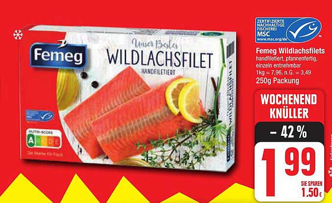 Entdecken Sie das großartige Femeg Wildlachsfilet Angebot im neuesten Edeka Prospekt. Neben diesem Angebot finden Sie noch viele weitere attraktive Rabatte. Sie können das Femeg Wildlachsfilet einfach online über die Edeka Website bestellen oder in einem Geschäft in Ihrer Nähe kaufen.