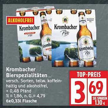 Sehen Sie sich jetzt das Krombacher Bierspezialitäten 6x0,33 l Flasche Angebot im Edeka Prospekt an. Dieses Angebot ist gültig von 15.09.2025 bis 20.09.2025.