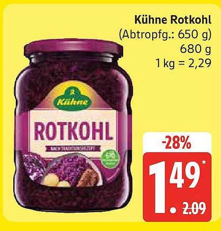 Sehen Sie sich jetzt das Kühne Rotkohl (Abtropfgewicht: 650 g, 680 g) Angebot im Edeka Prospekt an. Dieses Angebot ist gültig von 30.03.2025 bis 05.04.2025.
