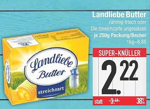 Aktuell bieten wir die Landliebe Butter zum attraktiven Preis von nur 2,22 € an, während der Normalpreis bei 3,59 € liegt. Das bedeutet eine Ersparnis von 1,37 € oder stolze 38%! Nutzen Sie die Gelegenheit, Ihre Vorräte aufzufüllen und sparen Sie dabei!