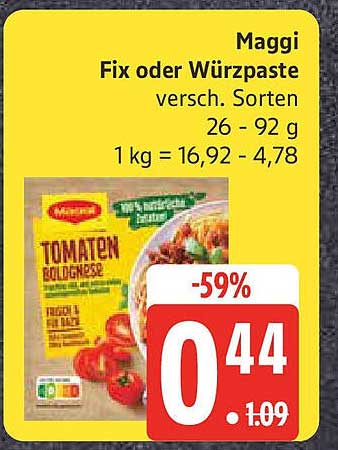 Sehen Sie sich jetzt das Maggi Fix oder Würzpaste verschieden Sorten Angebot im Edeka Prospekt an. Dieses Angebot ist gültig von 30.03.2025 bis 05.04.2025.