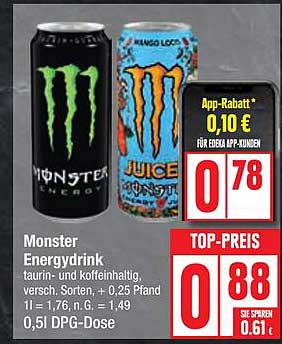 Entdecken Sie das großartige Monster Energydrink Angebot im neuesten Edeka Prospekt. Neben diesem Angebot finden Sie noch viele weitere attraktive Rabatte. Sie können das Monster Energydrink einfach online über die Edeka Website bestellen oder in einem Geschäft in Ihrer Nähe kaufen.