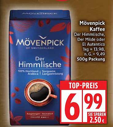 Sehen Sie sich jetzt das Mövenpick Kaffee Der Himmlische 500g Angebot im Edeka Prospekt an. Dieses Angebot ist gültig von 22.09.2025 bis 27.09.2025.