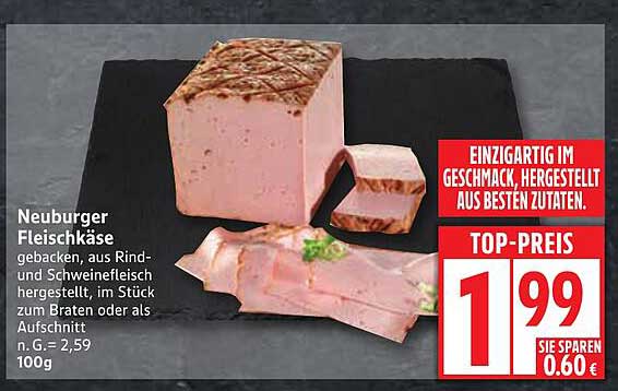 Sehen Sie sich jetzt das Neuburger Fleischkäse Angebot im Edeka Prospekt an. Dieses Angebot ist gültig von 08.09.2025 bis 13.09.2025.