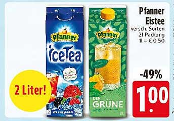 Aktuell erhalten Sie die 2-Liter-Packung Pfanner Eistee zum sensationellen Preis von nur 1,00 Euro. Vergleichsweise liegt der Normalpreis bei 1,50 Euro, was eine Ersparnis von 33% bedeutet. Profitieren Sie von diesem tollen Preis und stocken Sie Ihren Vorrat auf!
