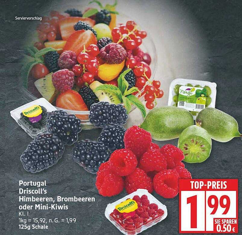Entdecken Sie die fruchtige Vielfalt unserer aktuellen Aktion mit Driscoll’s Himbeeren, Brombeeren oder Mini-Kiwis. Dieses Angebot ist perfekt für alle, die frische und schmackhafte Beeren lieben. Frisch aus Portugal kommen diese hochwertigen Früchte und bringen einen Hauch von Sommer auf Ihren Tisch. Versüßen Sie sich die Tage mit der natürlichen Süße dieser Beeren und erfreuen Sie Ihre Familie und Freunde mit einem bunten Obstsalat oder leckeren Desserts.