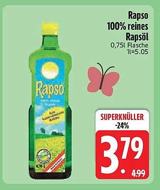 Sehen Sie sich jetzt das Rapso 100% reines Rapsöl 0,75L Flasche Angebot im Edeka Prospekt an. Dieses Angebot ist gültig von 06.04.2025 bis 12.04.2025.