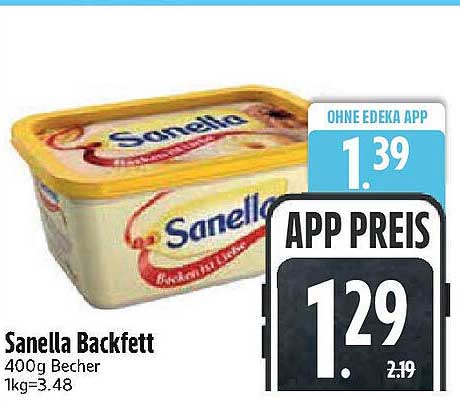 Im Vergleich zum regulären Preis von 2,19 Euro sparen Sie hier direkt 90 Cent! Ein unschlagbares Angebot, das Sie nicht verpassen sollten: Sanella Backfett ist zum Aktionspreis von nur 1,29 Euro erhältlich. Nutzen Sie die Gelegenheit, um gleich mehrere Becher zu kaufen und Ihre Backprojekte zum Erfolg zu führen.