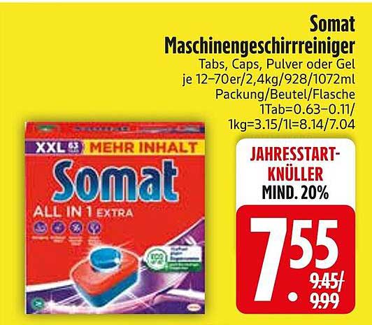 Sehen Sie sich das Somat Maschinen Geschirrreiniger Angebot bei Edeka an! Dieses fantastische Angebot ist jetzt im neuesten Edeka Prospekt verfügbar. Nutzen Sie diese Chance und sparen Sie viel bei Ihrem Einkauf.