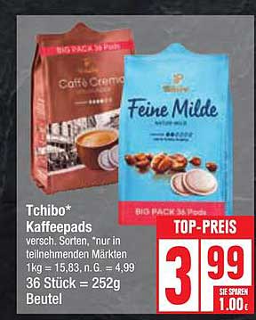 Sehen Sie sich das Tchibo* Kaffeepads Angebot bei Edeka an! Dieses fantastische Angebot ist jetzt im neuesten Edeka Prospekt verfügbar. Nutzen Sie diese Chance und sparen Sie viel bei Ihrem Einkauf.