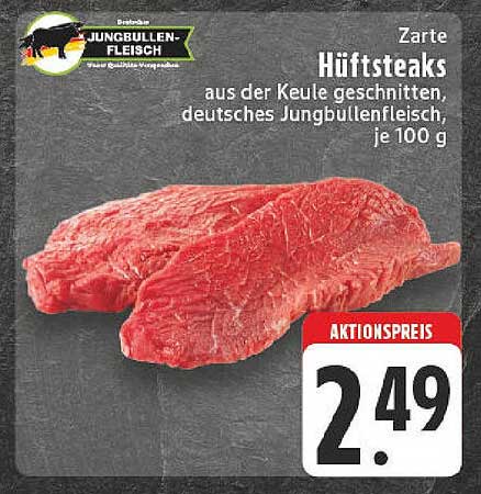 Sehen Sie sich jetzt das Zarte Hüftsteaks aus der Keule, deutsches Jungbullenfleisch, je 100 g Angebot im Edeka Prospekt an. Dieses Angebot ist gültig von 27.07.2025 bis 02.08.2025.