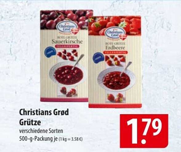 Sehen Sie sich jetzt das Christians Grød Grütze - verschiedene Sorten Angebot im Famila Nord Ost Prospekt an. Dieses Angebot ist gültig von 07.07.2025 bis 12.07.2025.