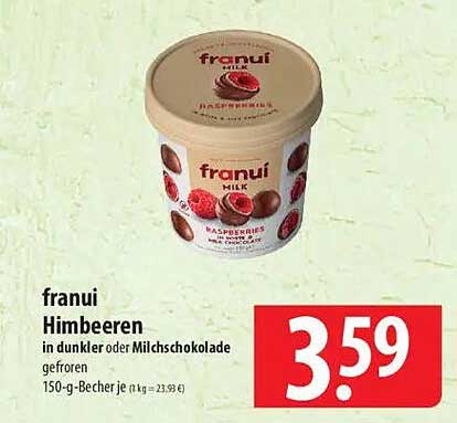Sehen Sie sich jetzt das franui Himbeeren in dunkler oder Milchschokolade gefroren Angebot im Famila Nord Ost Prospekt an. Dieses Angebot ist gültig von 01.09.2025 bis 06.09.2025.