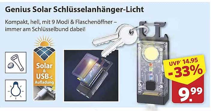 Entdecken Sie das praktische Genius Solar Schlüsselanhänger-Licht, das nicht nur durch seine kompakte Größe besticht, sondern auch durch vielseitige Einsatzmöglichkeiten. Egal, ob Sie es auf dem Weg nach Hause benötigen oder bei einem nächtlichen Outdoor-Abenteuer – dieses innovative Licht ist Ihr idealer Begleiter. Mit seiner Solar- und USB-C-Aufladung ist es umweltfreundlich und stets einsatzbereit. Dieses Angebot gilt vom 30. Juni bis 5. Juli 2025, also greifen Sie schnell zu!