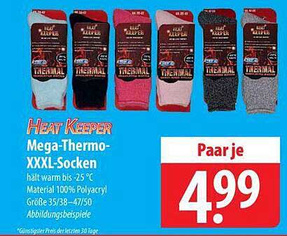 Entdecken Sie das großartige Heat Keeper Mega-Thermo-Xxxl-Socken Angebot im neuesten Famila Nord Ost Prospekt. Neben diesem Angebot finden Sie noch viele weitere attraktive Rabatte. Sie können das Heat Keeper Mega-Thermo-Xxxl-Socken einfach online über die Famila Nord Ost Website bestellen oder in einem Geschäft in Ihrer Nähe kaufen.