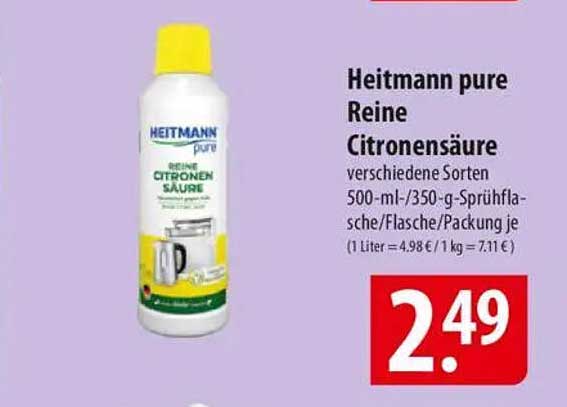 Sehen Sie sich jetzt das Heitmann pure Reine Citronsäure 500 ml Angebot im Famila Nord Ost Prospekt an. Dieses Angebot ist gültig von 27.10.2025 bis 01.11.2025.