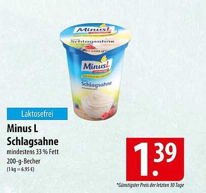 Aktuell können Sie die Minus L Schlagrahm zum Preis von nur 1,39 € erwerben. Im Vergleich zum durchschnittlichen Marktpreis von 6,69 € pro Kilogramm ist dies ein unglaubliches Angebot. Diese Ersparnis macht es umso attraktiver, gleich mehrere Becher einzukaufen und Ihre Vorräte aufzufüllen.