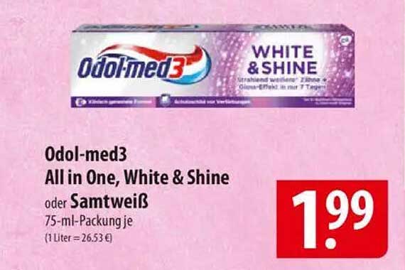 Sehen Sie sich jetzt das Odol-med3 All in One, White & Shine oder Samtweiß 75-ml-Packung Angebot im Famila Nord Ost Prospekt an. Dieses Angebot ist gültig von 22.04.2025 bis 26.04.2025.