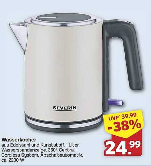 Mit einem reduzierten Preis von 24,99 Euro anstelle von 39,99 Euro sparen Sie satte 38%. Das macht dieses Angebot besonders attraktiv! Nutzen Sie die Gelegenheit und gönnen Sie sich diesen praktischen Wasserkocher zu einem unschlagbaren Preis. Der Severin Wasserkocher kombiniert Qualität mit einem hervorragenden Preis-Leistungs-Verhältnis.