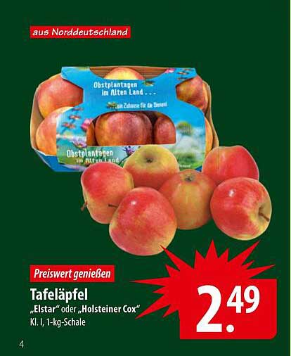 Sehen Sie sich jetzt das Tafeläpfel "Elstar" oder "Holsteiner Cox" 1-kg-Schale Angebot im Famila Nord Ost Prospekt an. Dieses Angebot ist gültig von 29.09.2025 bis 04.10.2025.