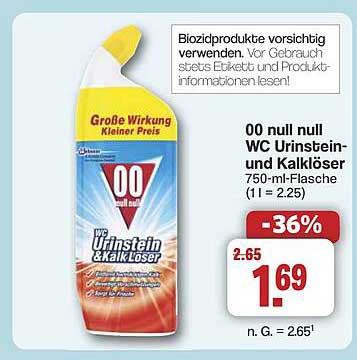 Sehen Sie sich jetzt das 00 null null WC Urinstein- und Kalklöser 750-ml-Flasche Angebot im Famila Nord West Prospekt an. Dieses Angebot ist gültig von 22.09.2025 bis 27.09.2025.