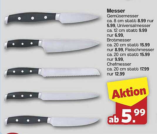 Der Preis startet bereits ab 5,99 € – das Gemüsemesser, normalerweise für 8,99 € erhältlich, kostet jetzt nur 5,99 €. Das Universalmesser ist jetzt für 6,99 € erhältlich, statt regulär 9,99 €. Diese Preisnachlässe bieten Ihnen die Gelegenheit, Ihre Küchenausstattung zu einem unschlagbaren Preis aufzurüsten.