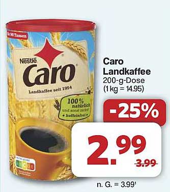 Besonders attraktiv ist der aktuelle Preis von nur 2,99 €, was einer Ersparnis von 25 % im Vergleich zum ursprünglichen Preis von 3,99 € entspricht. Dies macht den Kauf des Caro Landkaffees zu einer hervorragenden Entscheidung für alle, die Wert auf Qualität und Preis legen.