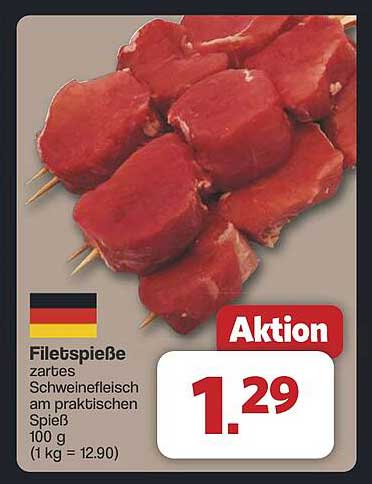 Der aktuelle Preis für die Filetspieße beträgt nur 1,29 Euro pro 100 g. Im Vergleich zum Normalpreis von 12,90 Euro pro kg bedeutet das eine erhebliche Ersparnis. Nutzen Sie diese Gelegenheit, um sich mit hochwertigem Fleisch einzudecken und Ihre Gäste mit einem köstlichen Gericht zu überraschen.
