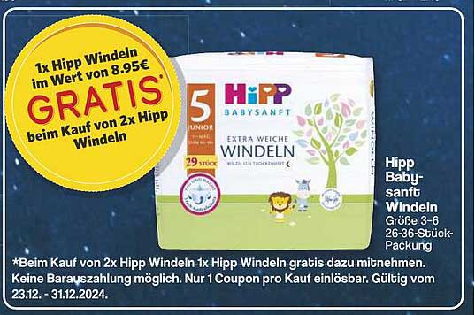 Sehen Sie sich jetzt das Hipp Babysanfte Windeln Angebot im Famila Nord West Prospekt an. Dieses Angebot ist gültig von 23.12.2024 bis 31.12.2024.