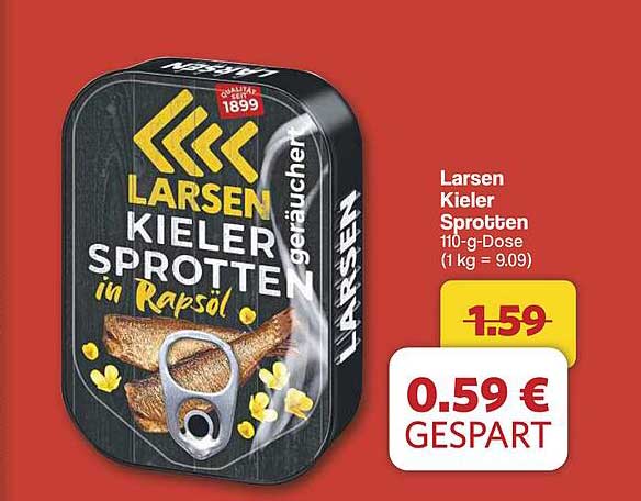Sehen Sie sich jetzt das Larsen Kieler Sprotten in Rapsöl 110-g-Dose Angebot im Famila Nord West Prospekt an. Dieses Angebot ist gültig von 10.06.2025 bis 14.06.2025.