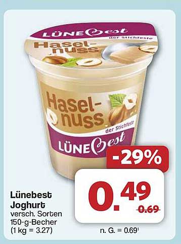 Aktuell erhalten Sie den Lünebest Joghurt zu einem Sonderpreis von nur 0,49 Euro. Der reguläre Preis beträgt 0,69 Euro, was einer Ersparnis von 29 % entspricht. Nutzen Sie diese Gelegenheit, um sich einen Vorrat an Joghurt zu unschlagbaren Preisen zuzulegen!