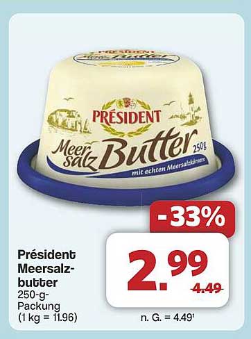 Jetzt ist der perfekte Zeitpunkt, um diese exquisite Meersalzbutter zu probieren! Zum Aktionspreis von nur 2,99 € (statt 4,49 €) sparen Sie sagenhafte 33%. Dies macht das Angebot nicht nur günstig, sondern auch besonders attraktiv für hochwertige Lebensmittel. Nutzen Sie die Gelegenheit und bereichern Sie Ihren Speiseplan mit dieser edlen Butter!