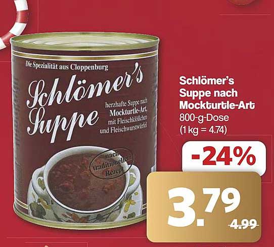 Sehen Sie sich jetzt das Schlömer's Suppe nach Mockturtle-Art Angebot im Famila Nord West Prospekt an. Dieses Angebot ist gültig von 25.11.2024 bis 30.11.2024.