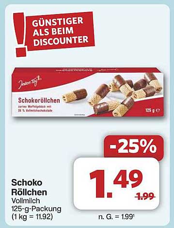 Diese 125-g-Packung enthält frisch verpackte Schoko Röllchen, die aus hochwertigen Zutaten hergestellt werden. Die Waffeln sind besonders knusprig und die Vollmilchschokolade schmilzt förmlich im Mund. Der Preis pro Kilogramm beträgt lediglich 11,92 €, was eine tolle Ersparnis darstellt.
