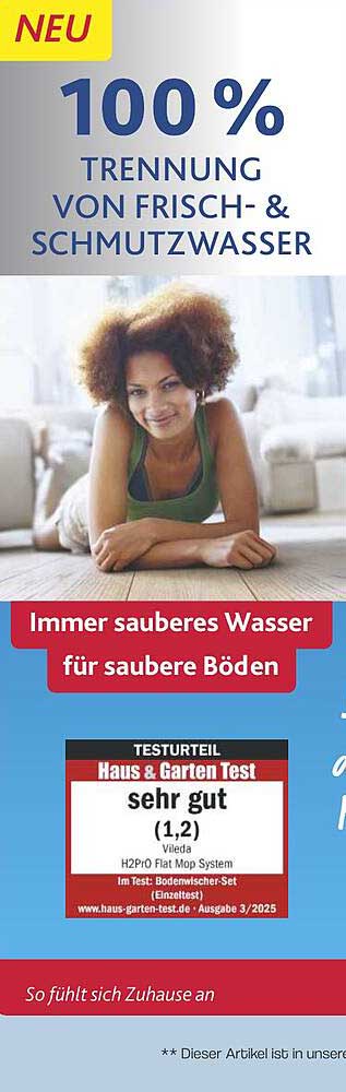 Sehen Sie sich jetzt das Vileda H2O Pro Flat Mop System – 100 % Trennung von Frisch- & Schmutzwasser Angebot im Famila Nord West Prospekt an. Dieses Angebot ist gültig von 29.09.2025 bis 04.10.2025.
