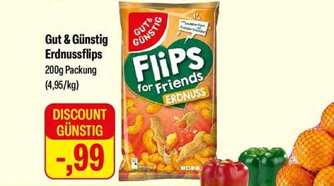 Sehen Sie sich jetzt das Gut & Günstig Erdnussflips 200g Packung Angebot im Feneberg Prospekt an. Dieses Angebot ist gültig von 24.04.2025 bis 26.04.2025.