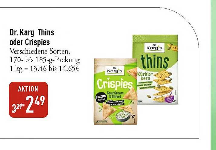 Sehen Sie sich jetzt das Dr. Karg Thins oder Crispies - Verschiedene Sorten Angebot im Galeria Markthalle Prospekt an. Dieses Angebot ist gültig von 03.11.2025 bis 10.11.2025.