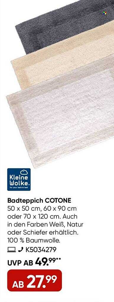 Der Badteppich COTONE besteht zu 100 % aus hochwertiger Baumwolle, die für ihre Strapazierfähigkeit und Weichheit bekannt ist. Er ist in den Größen 50 x 50 cm, 60 x 90 cm und 70 x 120 cm erhältlich. Durch die drei attraktiven Farben Weiß, Natur und Schiefer findet jeder das passende Modell für sein Badezimmer. Die hochwertige Verarbeitung sorgt dafür, dass der Teppich auch nach häufigem Waschen lange schön bleibt.