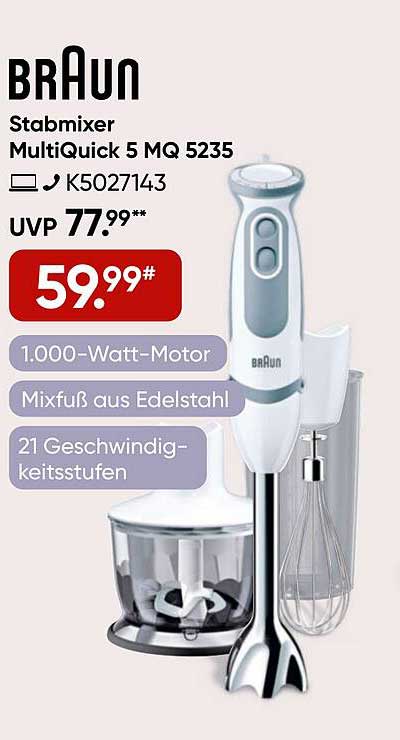Der Braun Stabmixer MultiQuick 5 MQ 5235 ist die ideale Ergänzung für jede Küche. Mit einer beeindruckenden Leistung von 1.000 Watt und einer Vielzahl an Funktionen ermöglicht dieser Stabmixer müheloses Pürieren, Mixen und Schneiden. Ob für Suppen, Saucen oder Smoothies – dieser Küchenhelfer überzeugt durch seine Vielseitigkeit und Effizienz. Aktuell erhalten Sie dieses Top-Produkt zu einem unschlagbaren Preis, der vom 2. bis 8. April 2025 gültig ist.