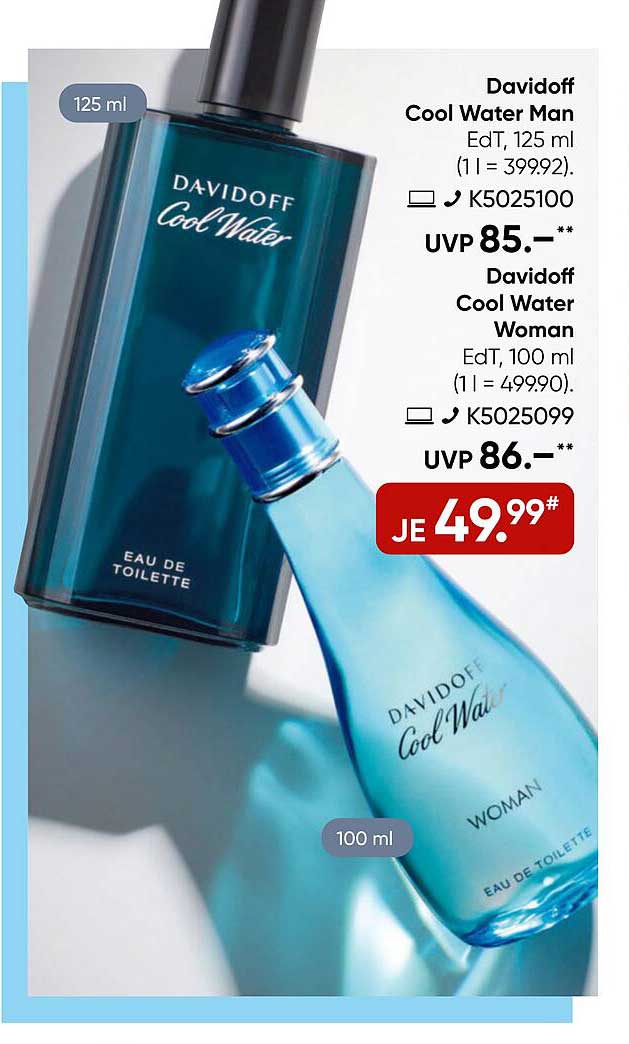 Der bisherige Preis für das Davidoff Cool Water Man betrug 85 Euro und für das Cool Water Woman 86 Euro. Mit dem aktuellen Angebotspreis von nur 49,99 Euro für jedes Eau de Toilette sparen Sie deutlich. Das ist eine Ersparnis von über 35 Euro! Ein Garant für einen perfekten Kauf!
