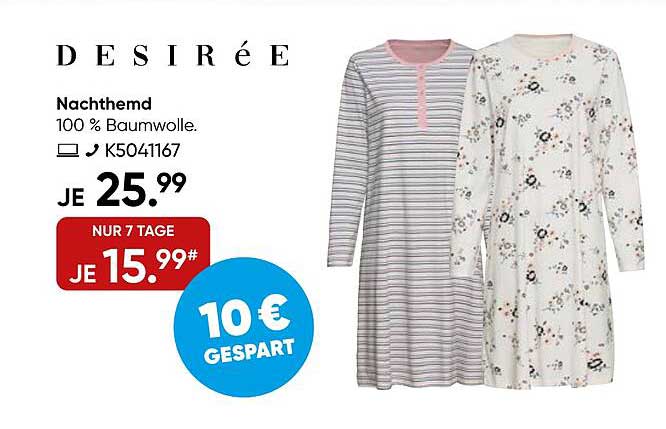 Ursprünglich zum Preis von 25,99 € angeboten, können Sie die DESIRÉE Nachtwäsche jetzt für nur 15,99 € erwerben. Das bedeutet für Sie eine Ersparnis von 10 €, die Sie in andere schöne Dinge investieren können. Ein Angebot, das nicht nur Ihr Schlafzimmer, sondern auch Ihren Geldbeutel freut!