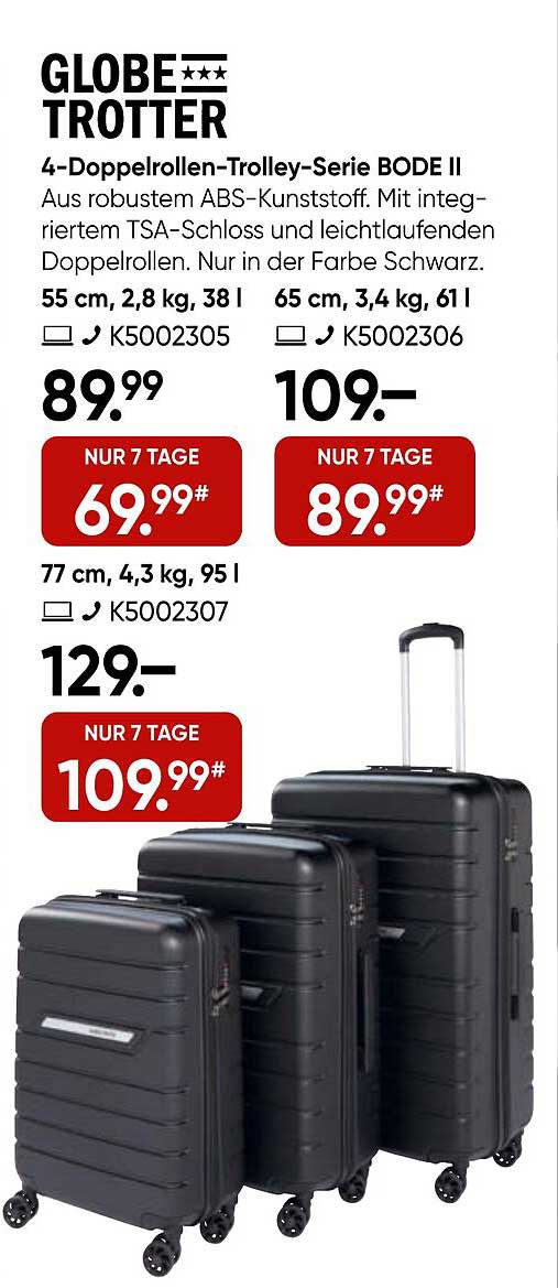 Sehen Sie sich das Globe***Trotter 4-Doppelrollen-Trolley-Serie Bode Ii Angebot bei Galeria an! Dieses fantastische Angebot ist jetzt im neuesten Galeria Prospekt verfügbar. Nutzen Sie diese Chance und sparen Sie viel bei Ihrem Einkauf.